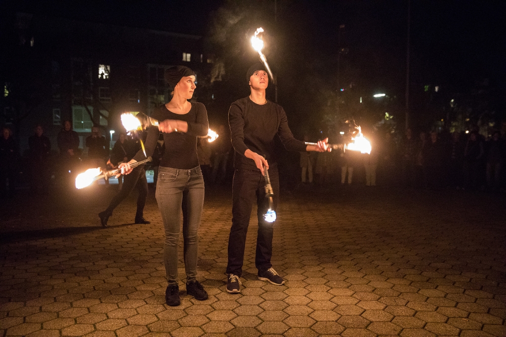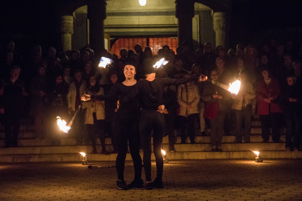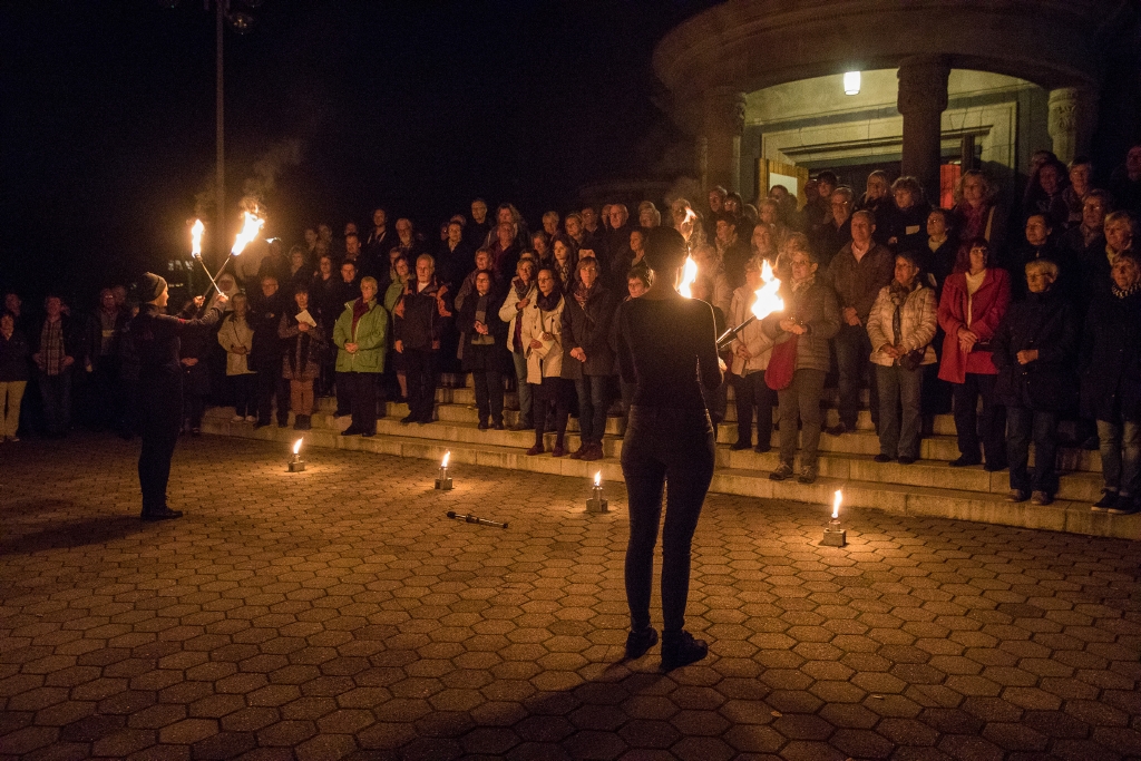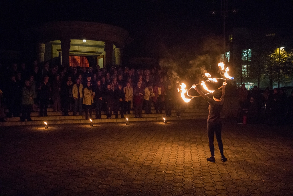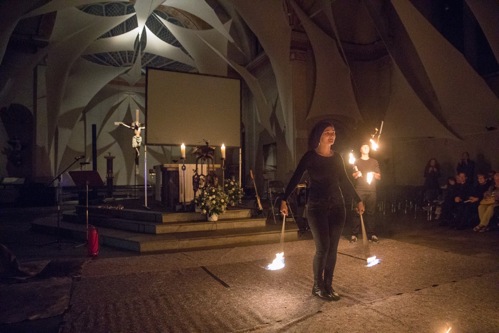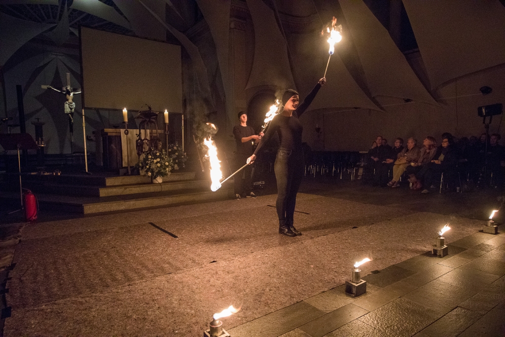 Von einer 21-jährigen Studentin der Wirtschaftspsychologie, über eine Künstlerin, von einem Schulleiter bis zu einem Komponisten, von einer Flüchtlingsberaterin bis zu einer Ordensschwester durften die Anwesenden sich begeistern und anstecken lassen. Abgerundet wurde der Abend vom Zirkus Ratz Fatz mit seiner spektakulären Feuershow und dem Musiker Thomas Krause.