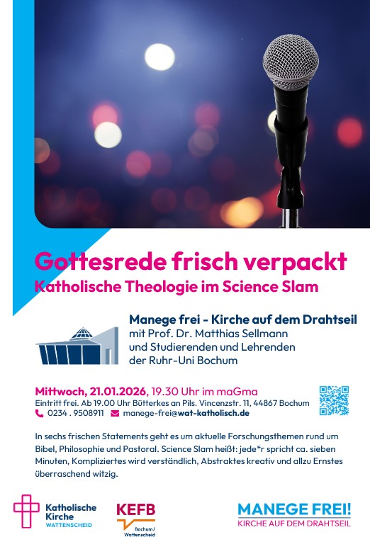 Manege frei am 21.01.2026: Gottes Rede frisch verpackt – Katholische Theologie im Science Slam21. Januar 2026|Aktuelles Home » Gemeindenachrichten » Aktuelles » Manege frei am 21.01.2026: Gottes Rede frisch verpackt – Katholische Theologie im Science Slam Beginn 19:30 Uhr; ab 19:00 „Bütterkes an Pils“ Nächste Termine:25.03.2026:Dr. Georg Röwekamp: Christen in der Region Gaza- eine vergessene Geschichte20.05.2026:Sahra Vicerra: Wie ist Jesus weiß geworden? Mein Traum von einer Kirche ohne Rassismus Schreib etwas dazu Antworten abbrechenIhre E-Mailadresse wird nicht veröffentlicht. Erforderliche Felder sind markiert *Name* E-Mail* Website Save my name, email, and website in this browser for the next time I comment.